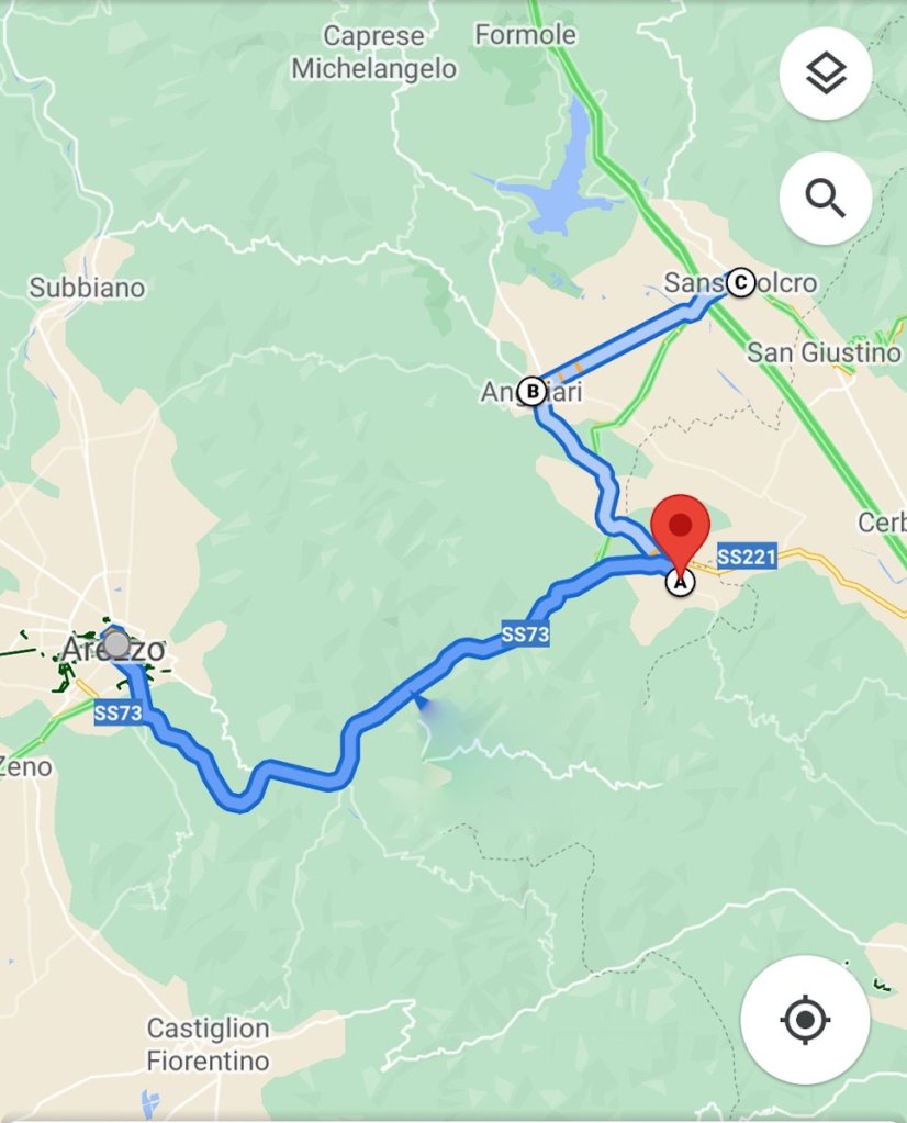 Da Anghiari, percorrendo una lunga strada rettilinea, si raggiunge a Sansepolcro, luogo natio di Piero della Francesca, dove al Museo Civico si trovano quattro opere dell’artista: il Polittico della Misericordia (dipinto su tavola), San Ludovico (affresco), San Giuliano (affresco) e la Resurrezione (affresco).