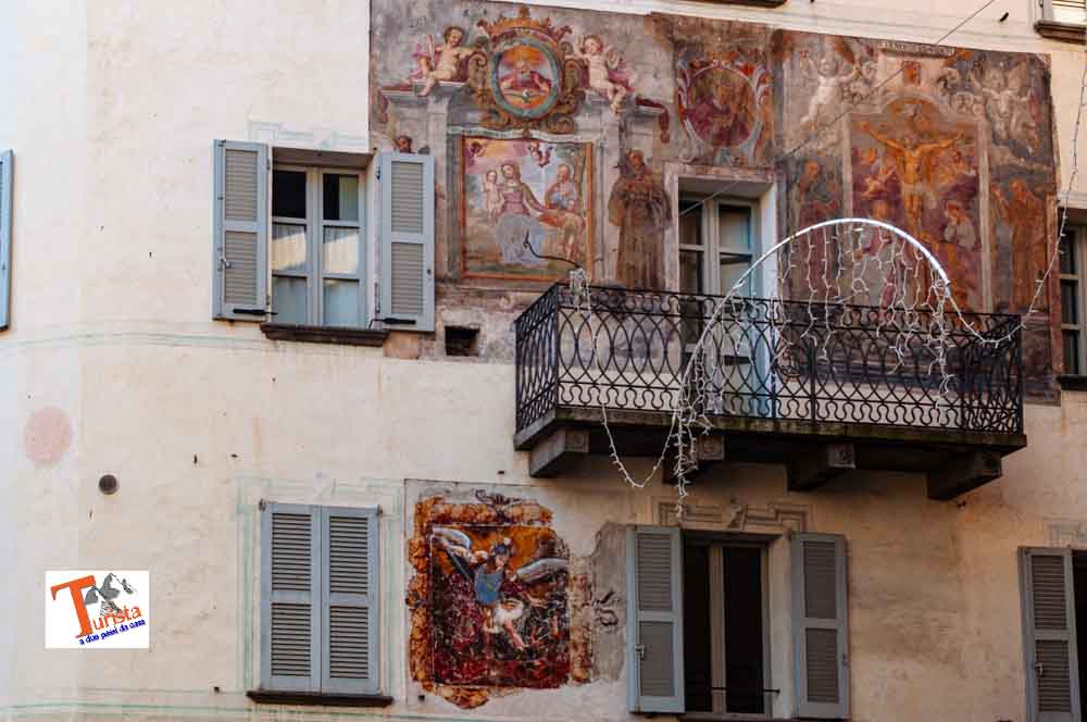 Torniamo al centro storico. La nostra visita a Morbegno continua ammirando vie e piazze. Ci colpisce in particolare via Cotta Carlo, dove si ammirato le facciate degli edifici, alcune delle quali affrescate con scene bibliche e di santi.